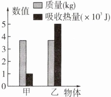 5. 数据模型分析 现有甲、乙两个物体,测得它们在一定质量下温度升高$1^{\circ}C$时吸收的热量,根据测得的数值绘制成直方图(如图),则下列判断正确的是(