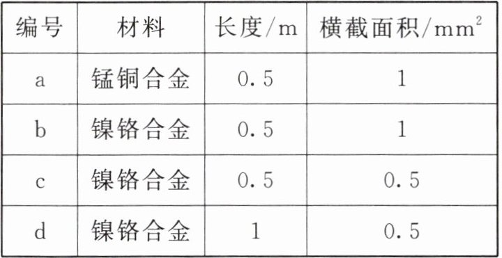 6. (多选)在“探究影响电阻大小的因素”实验中,小明设计了如图所示的电路。a、b、c、d四根电阻丝的规格、材料如表所示,则(