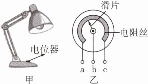 13. 如图所示,图甲为某亮度可调节台灯,图乙为其用于调光的电位器结构图。a、b、c 是它的三个接线柱,a、c 分别与弧形电阻丝的两端相连,b 与金属滑片相连。为实现调光功能,电位器应与灯
