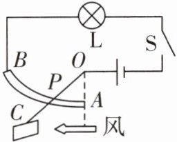 14. 跨学科实践 一位同学设计了一个风力测定仪,如图所示,O 是转动轴,OC 是金属杆,下面连接着一块受风板。无风时 OC 是竖直的,风越强,OC 杆偏转的角度越大。AB 是一段圆弧形电阻,P 点是金属杆与圆弧形电阻相接触的点,电路中接有一个小灯泡,测风力时,闭合开关 S 即可。通过分析可知:金属杆 OC 与圆弧形电阻 AB 组合在一起相当于一个