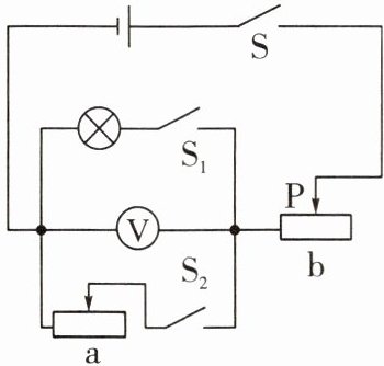 ② 只闭合$S$和$S_{2}$,保持滑动变阻器$b$的滑片位置不动,调节滑动变阻器$a$的滑片,使电压表的示数与第①步时