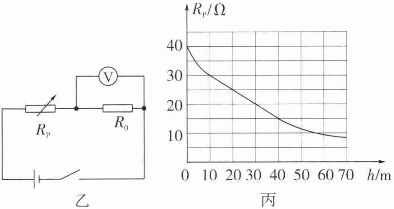 10. 跨学科实践(多选)为了保障潜水员潜水时的安全,潜水时会佩戴如图甲所示的水压表和深度表。如图乙所示是一款深度表的简化电路图。电源电压 $ U = 6V $ 且恒定不变,定值电阻 $ R_{0} = 10\Omega $,$ R_{P} $ 是压敏电阻,图丙是 $ R_{P} $ 的阻值随海水深度变化的图像,$ R_{P} $ 允许通过的最大电流为 $ 0.24A $,深度表由电压表(测量范围 $ 0\sim 3V $)改装。下列说法正确的是(