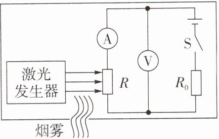 9. 公共场所严禁吸烟,小明设计了一种简易烟雾报警控制器如图所示。电路中 $ R_{0} $ 为定值电阻,$ R $ 为光敏电阻,其阻值随光照强度的增大而减小,烟雾增大到一定程度使电压表 $ V $ 的指针偏转到某区域时触发报警系统。以下做法能使控制器在烟雾较淡时就触发报警系统的是(