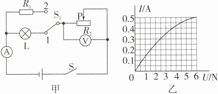 9. 如图甲,电源电压不变,电流表测量范围为 0~0.6 A,电压表测量范围为 0~3 V,定值电阻 $ R_1 $ 大于 5 Ω,滑动变阻器 $ R_2 $ 的规格为“20 Ω 1 A”,小灯泡 L 的电流随其两端电压变化的图像如图乙所示。若闭合开关 S、$ S_1 $ 接 1,在电路安全的情况下,变阻器 $ R_2 $ 允许接入电路的最大阻值为 15 Ω。若闭合开关 S、$ S_1 $ 接 2,在电路安全的情况下,电路中允许通过的最大电流是最小电流的 1.5 倍。求: