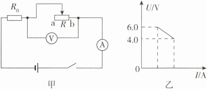 7. 如图甲所示,电源电压恒定,定值电阻 $ R_0 $ 的阻值为 8 Ω 。将滑动变阻器的滑片从 a 端滑到中点的过程中,电压表示数 U 与电流表示数 I 之间的关系图像如图乙所示。则滑动变阻器 R 的最大阻值为