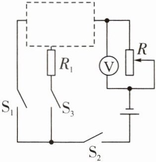 6. 如图所示,电源电压为6V,R为“30Ω 0.25A”滑动变阻器,R₁为“10Ω 0.4A”电阻,电压表测量范围为0~3V。图中虚线框内接有一只“20Ω 0.3A”电阻R₂(未画出)。已知:①闭合S₁和S₂,断开S₃时,调节R,使其接入电路的阻值为10Ω,此时电路的电流为0.2A;②断开S₁,闭合S₂、S₃,调节R,使其接入电路的阻值为6Ω,此时电压表的示数为1.0V。