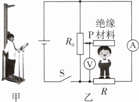 3. 图甲是身高、体重测量仪,电路原理如图乙所示。电路中有一个电压表和一个电流表,当体检者站在台面上时,其中一个电表自动显示身高的大小,另一个电表自动显示体重的大小。压敏电阻R的阻值随压力增大而减小,滑片P随所测量对象身高增高而上滑。下列分析正确的是()