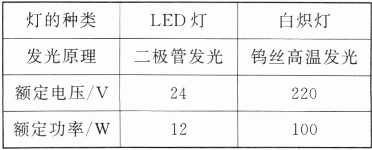 1. (多选)实验室通过实验发现表中 LED 灯和白炽灯在正常工作时,光照强度相同,有关数据如表所示。根据表中数据判断下列说法不正确的是(