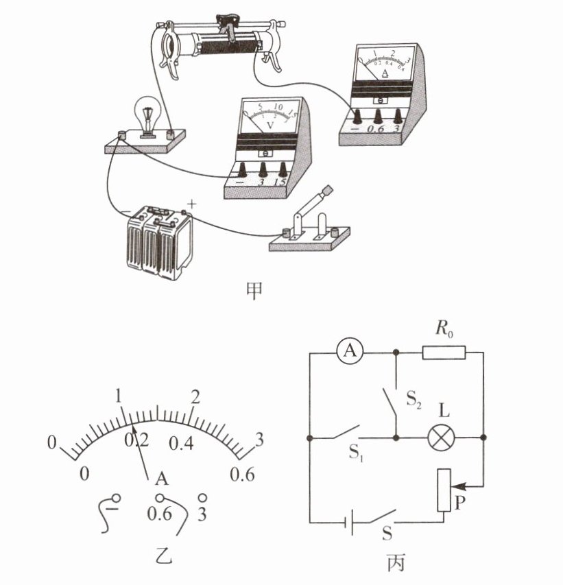 W;【拓展】实验中电压表意外损坏,小组同学讨论后,选用阻值为 $ R_0 $ 的定值电阻进行实验,设计如图丙所示的电路也测出了小灯泡的额定功率。请将实验步骤补充完整: