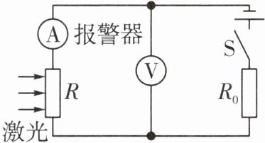2. 如图所示,小明同学设计了一种烟雾报警装置,$ R_{0} $ 的电阻为 $ 40 \Omega $,$ R $ 为光敏电阻,其阻值随激光的光照强度减弱而增大。当电路中电流小于或等于 $ 0.3 \, A $ 时,烟雾报警器报警。开关 $ S $ 闭合后,当电流为 $ 0.5 \, A $ 时,光敏电阻 $ R $ 的电功率为 $ 4 \, W $。下列说法正确的是(