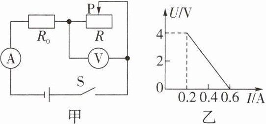 5. 如图甲所示的电路中,电源电压不变,$ R_{0} $ 为定值电阻,$ R $ 为滑动变阻器。在滑片 $ P $ 从最右端向最左端滑动过程中,电压表与电流表的示数变化关系如图乙所示。下列说法中正确的是(