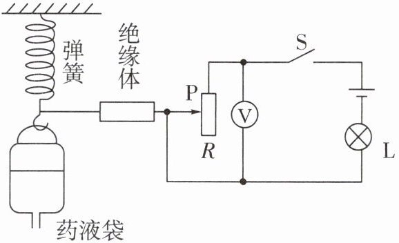 1. 小亮设计了如图所示的输液提示器电路图,其中电源电压、灯丝电阻不变,滑片 P 能随着弹簧的长度变化而上下滑动。闭合开关后,在输液过程中,以下说法中不正确的是(