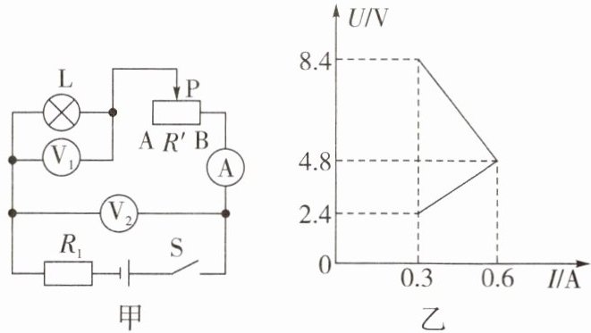 6. 如图甲所示的电路中电源电压恒定,小灯泡 $ L $ 的灯丝电阻不变,$ R_{1} $ 是定值电阻。闭合开关 $ S $,将滑动变阻器的滑片 $ P $ 由 $ A $ 端移到 $ B $ 端,两电压表示数随电流表示数变化的关系如图乙所示。则定值电阻 $ R_{1} $ 为 $$