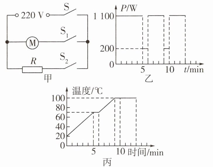 12. 如图甲所示是小明家豆浆机的工作原理图,其中电动机是用来带动刀头将原料进行粉碎打浆的,额定功率是200W。R是加热电阻,额定功率是1100W。如图乙、丙所示是此豆浆机做一次豆浆时的工作信息。小明向豆浆机中加入黄豆和清水共1.5kg,下列说法中正确的是(