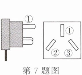 7. 如图是家用电热水壶的插头和对应的插座,插头的插脚①较长,目的是将插头插入插座时,可确保电热水壶的金属外壳先接触