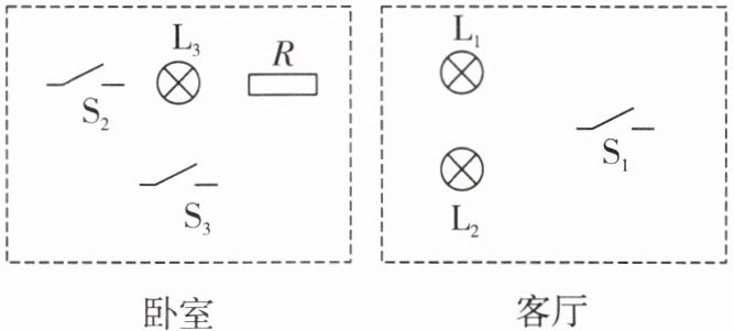 2. 设计一个家庭电路,要求客厅开关 $ S_1 $ 控制 $ L_1 $ 和 $ L_2 $;卧室开关 $ S_2 $ 控制壁灯,该壁灯的两种亮度通过开关 $ S_3 $ 调节。请在下图中连线,形成符合要求的完整电路图。