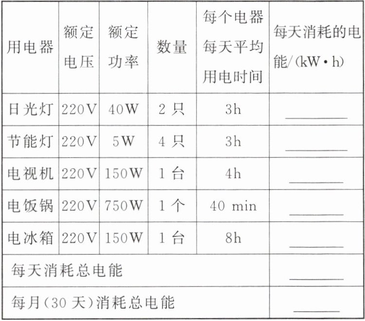 1. 列出家中所有用电设备,记录每个设备的功率,如下表所示。请计算出每个用电器每天消耗的电能。