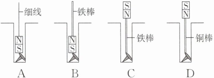 2. 在一次课外实验活动中,一颗铁质的小螺丝掉入细小狭长的小洞中。小科设计了以下四种方案,其中不能取出小螺丝的是(