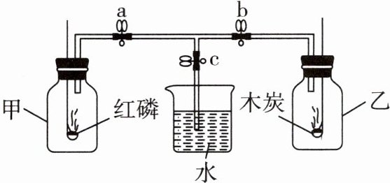 11. 关闭弹簧夹 a、b、c,使过量的红磷和木炭分别在盛有空气的等容积的甲、乙两瓶中同时燃烧,如图所示。请回答下列问题: