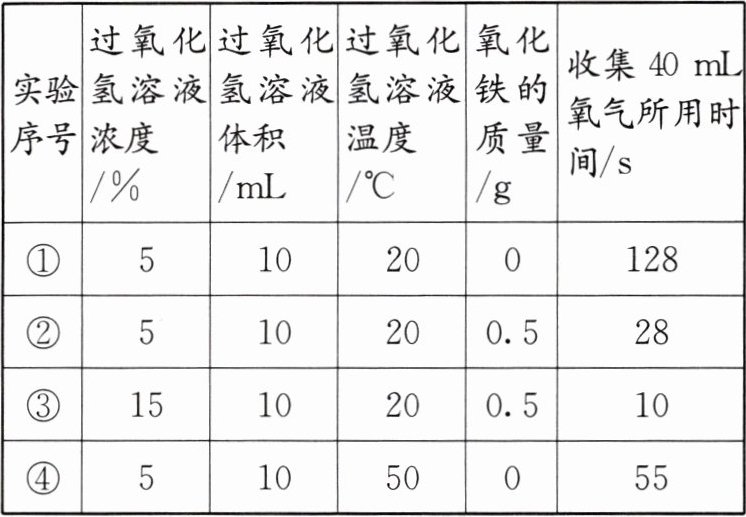 (5)催化剂的种类 在两支试管中分别加入10 mL 5%过氧化氢溶液,然后分别加入0.5 g二氧化锰和0.5 g氧化铁,记录收集40 mL氧气所需的时间