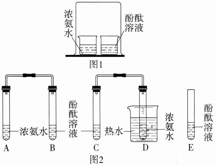 向B、C、E三支试管中分别加入5mL蒸馏水,各滴入几滴无色酚酞溶液,振荡,观察溶液颜色。在试管A、D中分别加入5mL浓氨水,立即按图2连接好装置,并将试管D放置在盛有热水的烧杯中,观察现象。