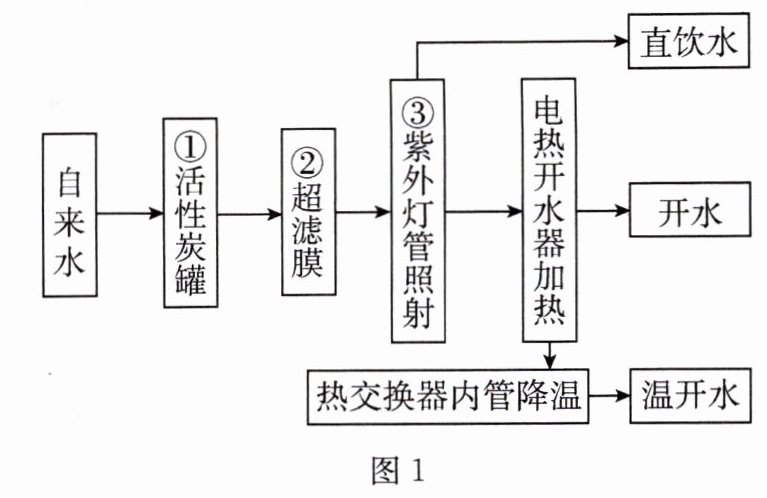 作用,除去颜色、异味的同时,也除去重金属离子。(4)紫外线灯管照射是为了消毒杀菌。直饮机使用方便,只要将其与自来水管对接,截留清除水中的有害物质(如微生物等)便能得到直饮水,直饮水属于