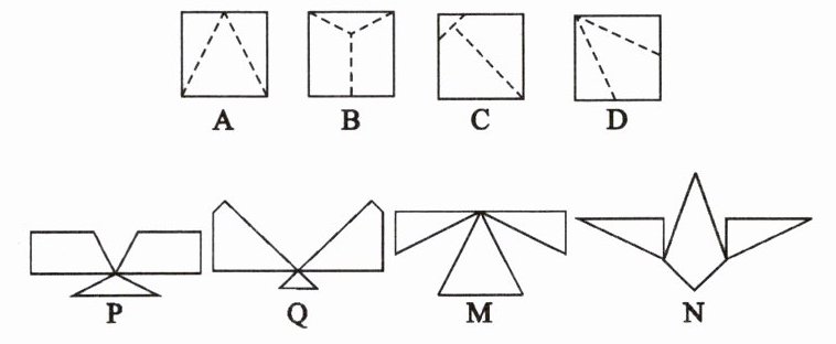 8. 如图,将标号为 $ A,B,C,D $ 的正方形沿图中的虚线剪开后,能拼接成标号为 $ P,Q,M,N $ 的四个图,试按照“图形剪开后能拼接成哪个图形”的对应关系填空: