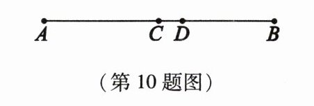 10. 如图,已知 $ D $ 是线段 $ AB $ 上一点,$ C $ 是线段 $ AB $ 的中点,若 $ AB = 10\ cm $,$ BD = 4\ cm $。