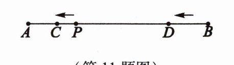 11. 如图,$ P $ 是线段 $ AB $ 上任意一点,$ AB = 12\ cm $,$ C $,$ D $ 两点分别从 $ P $,$ B $ 两点同时向点 $ A $ 运动,且点 $ C $ 的运动速度为 $ 2\ cm/s $,点 $ D $ 的运动速度为 $ 3\ cm/s $,运动的时间为 $ t\ s $。