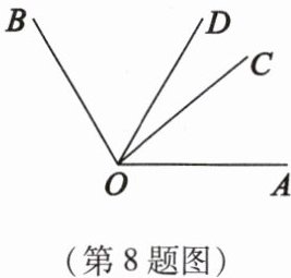 8. 如图,已知∠BOC = 2∠AOC,OD平分∠AOB,且∠AOC = 40°,求∠COD的度数。
