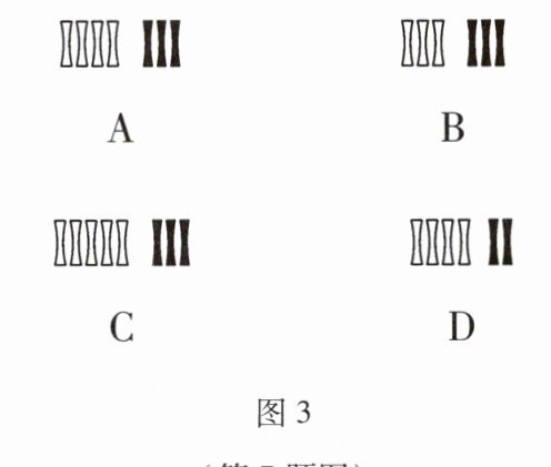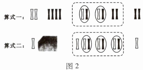 (2) 筹算是中国古代的计算方法之一,宋代数学家用白色筹码代表正数,用黑色筹码代表负数,如图 $2$ 中算式一表示的是 $(+2) + (-4) = -2$。按照这种算法,在图 $3$ 的四个选项中,图 $2$ 中算式二被盖住的部分是( )