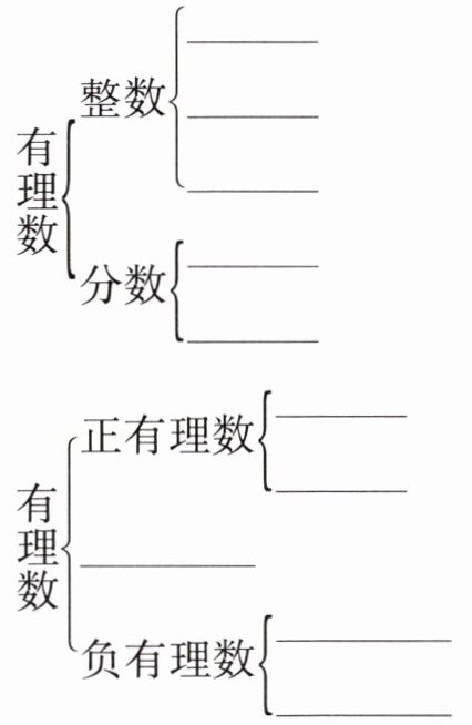 有理数$\begin{cases}整数\begin{cases}$_________$\\$_________$\\$_________$\end{cases} \\分数\begin{cases}$_________$\\$_________$\end{cases} \end{cases}$