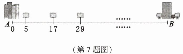 7. 如图,$A$,$B$两地之间有一条东西向的道路,在$A地的正东方向5km$处设置第一个广告牌,之后每往东$12km$就设置一个广告牌。一辆汽车从$A地的正东方向2km$处出发,沿此道路向东行驶,当经过第$n$个广告牌时,此辆汽车行驶的路程为( )