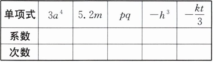 |单项式| $3a^{4}$ | $5.2m$ | $pq$ | $-h^{3}$ | $-\frac{kt}{3}$ |