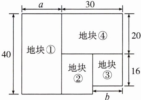 (1) 由图可知,地块①面积为$40a$,地块④面积为$30×20=600$,地块③面积为$16b$,地块②的长为$30 - b$、宽为$40 - 20=20$,面积为$20(30 - b)=600 - 20b$。总面积$S=40a + (600 - 20b) + 16b + 600=40a - 4b + 1200$。