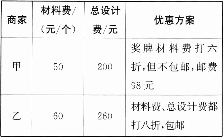 (2)设当制作x个奖牌时,根据甲、乙两个商家收费相同,列得方程$0.6×50x+200+98=0.8×60x+260×0.8$,解得$x=5.$答:当制作5个奖牌时,甲、乙两个商家收费相同.