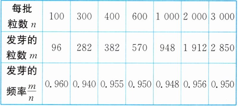 |发芽的频率 $\frac{m}{n}$|0.960|0.940|0.955|0.950|0.948|0.956|0.950|