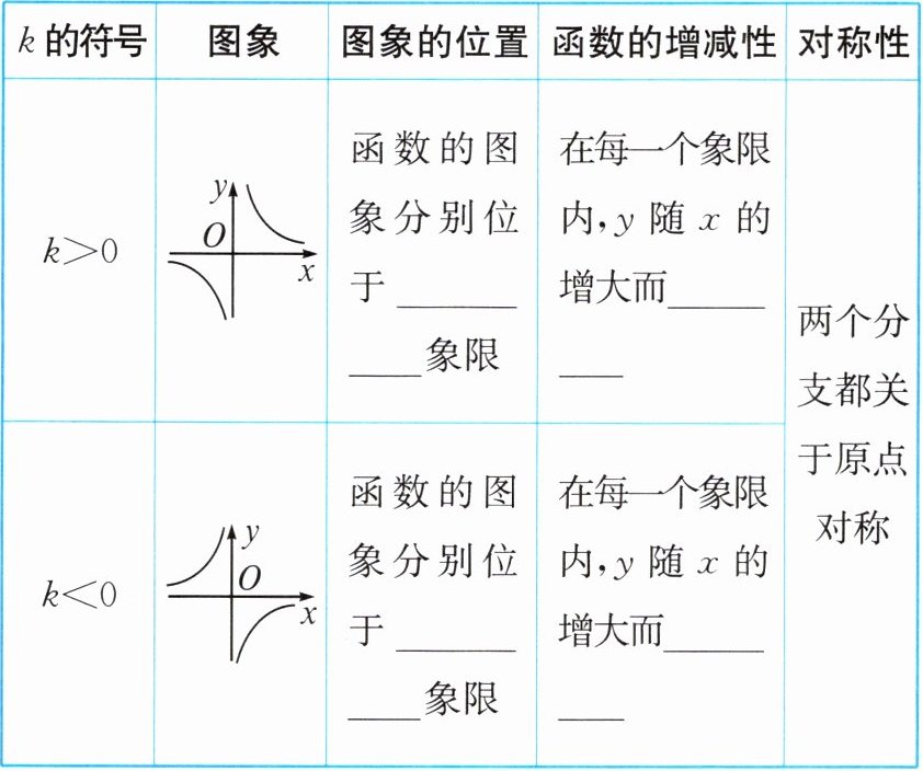 |两个分支都关于原点对称||k<0||函数的图象分别位于