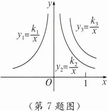 7. 已知反比例函数 $ y_1 = \frac{k_1}{x} $, $ y_2 = \frac{k_2}{x} $ 和 $ y_3 = \frac{k_3}{x} $ 的图象如图所示,则 $ k_1 $, $ k_2 $ 和 $ k_3 $ 的大小关系为