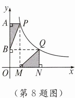 8. 如图,已知点P,Q是反比例函数 $ y = \frac{k}{x} $ 图象上的两点, $ PA \perp y $ 轴于点A, $ QN \perp x $ 轴于点N,作 $ PM \perp x $ 轴于点M, $ QB \perp y $ 轴于点B,连接PB,QM, $ \triangle ABP $ 的面积记为 $ S_1 $, $ \triangle QMN $ 的面积记为 $ S_2 $,则 $ S_1 $