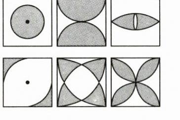 16. 为创建绿色校园,学校决定对一块正方形的空地进行种植花草,现向学生征集设计图案。图案要求只能用圆弧在正方形内加以设计,使正方形和所画的圆弧构成图案,种植花草部分用阴影表示。请你运用平移、旋转、轴对称等知识,在图③、图④、图⑤中画出三种不同的设计图案(温馨提示:在两个图案中,只有半径变化而圆心不变的图案属于同一种,例如:图①、图②只能算一种)。