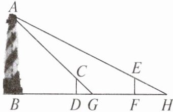 3. 如图,某水平地面上建筑物的高度为$AB$,在点$D和点F处分别竖立高是2$m的标杆$CD和EF$,两标杆相隔$52$m,并且建筑物$AB$、标杆$CD和EF$在同一竖直平面内.从标杆$CD后退2$m到点$G$处,在$G处测得建筑物顶端A和标杆顶端C$在同一条直线上;从标杆$FE后退4$m到点$H$处,在$H处测得建筑物顶端A和标杆顶端E$在同一直线上,则建筑物的高是