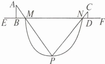 5. 小明为了测量出一深坑的深度,采取如下方案:如图,在深坑左侧用观测仪$AB从观测出发点A观测深坑底部P$,且观测视线刚好经过深坑边缘点$M$,在深坑右侧用观测仪$CD从观测出发点C观测深坑底部P$,且观测视线恰好经过深坑边缘点$N$,点$E$,$B$,$M$,$N$,$D$,$F$在同一水平线上.已知$AB\perp EF$,$CD\perp EF$,观测仪$AB高2$m,观测仪$CD高1$m,$BM = 1.6$m,$ND = 0.8$m,深坑宽度$MN = 8.8$m,请根据以上数据计算深坑深度是多少?