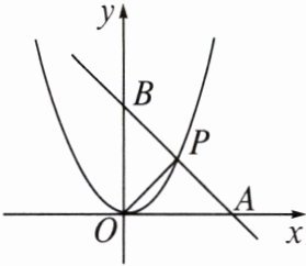 9. 如图,直线 $ l $ 经过 $ A(4,0) $ 和 $ B(0,4) $ 两点,它与抛物线 $ y = ax^{2} $ 在第一象限内相交于点 $ P $。已知 $ \triangle AOP $ 的面积为 $ 4 $,求 $ a $ 的值。