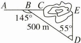 3. 如图,为了加快开凿隧道的施工进度,要在小山的两端同时施工. 在$AC上找一点B$,取$\angle ABD = 145^{\circ}$,$BD = 500m$,$\angle D = 55^{\circ}$,要使点$A$,$C$,$E$成一直线,那么开挖点$E离点D$的距离是(