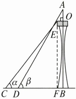 16. 如图,某塔观光层的最外沿点$E$为蹦极项目的起跳点,已知点$E离塔的中轴线AB的距离OE为10m$,塔高$AB为123m$($AB垂直地面BC$),在地面$C处测得点E的仰角\alpha = 45^{\circ}$,从点$C沿CB方向前行40m到达点D$,在点$D处测得塔尖A的仰角\beta = 60^{\circ}$,求点$E离地面的高度EF$.(结果精确到$1m$,参考数据$\sqrt{2} \approx 1.4$,$\sqrt{3} \approx 1.7$)