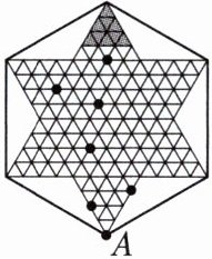 设对角线所在的直线为对称轴,根据中心对称的性质,通过三次对称跳行(先向上右斜对角跳过一步到第一个对称点,再继续向上左斜对角跳过一步到第二个对称点,最后向下左斜对角跳过一步到达对方区域),共 3 步可以使棋子 A 跳进对方区域(阴影部分的格点),且为最少步数。