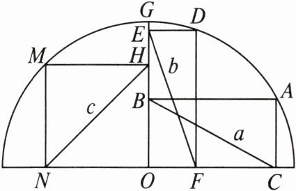 ★10. 如图,点 $ A $,$ D $,$ G $,$ M $ 在半圆 $ O $ 上,四边形 $ ABOC $,$ DEOF $,$ HMNO $ 均为矩形。设 $ BC = a $,$ EF = b $,$ NH = c $,则 $ a $,$ b $,$ c $ 之间有什么关系?