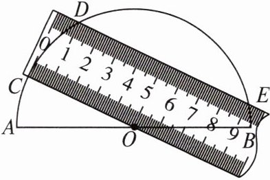 7. 如图,将一个两边都带有刻度的直尺放在半圆形纸片上,使其一边经过圆心 $ O $,另一边所在直线与半圆相交于点 $ D $,$ E $,量出半径 $ OC = 5 cm $,弦 $ DE = 8 cm $。求直尺的宽。