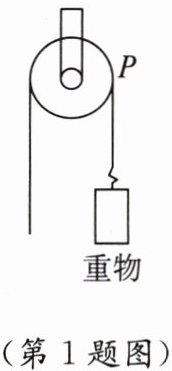 1. 如图,用一个半径为 $ 5 cm $ 的定滑轮带动重物上升,滑轮上一点 $ P $ 旋转了 $ 108^{\circ} $,假设绳索(粗细不计)与滑轮之间没有滑动,则重物上升了(